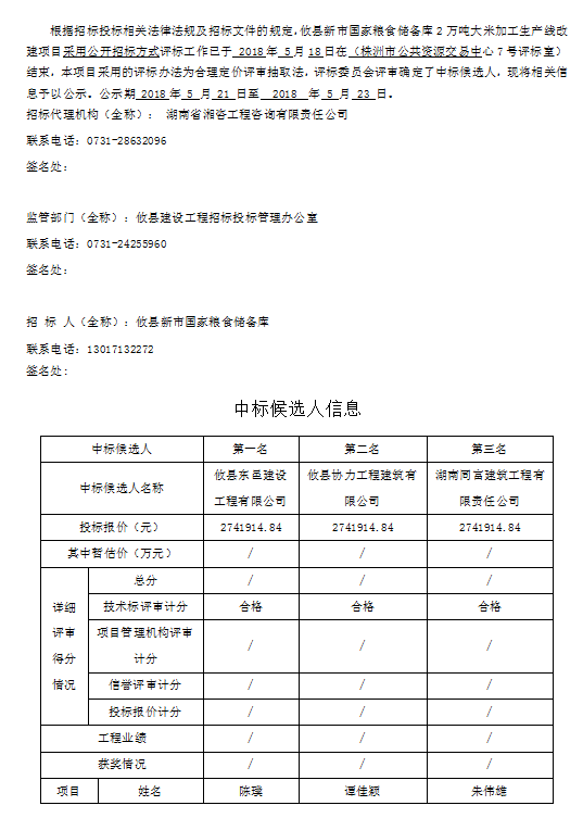 攸縣新市國家糧食儲備庫2萬噸大米加工生產(chǎn)線改建項目 招標(biāo)投標(biāo)信息公示表