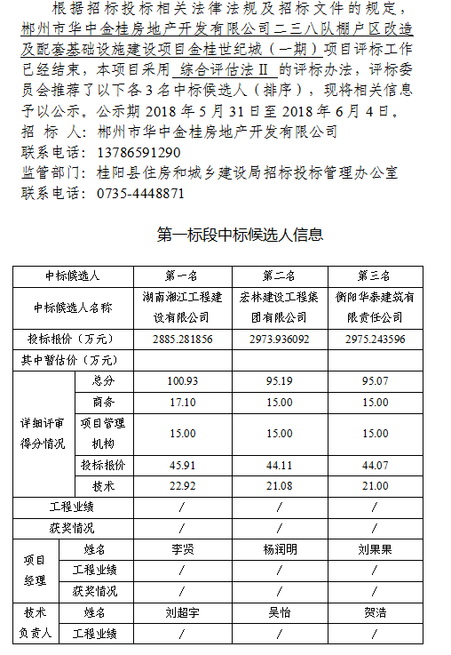 郴州市華中金桂房地產(chǎn)開發(fā)有限公司二三八隊(duì)棚戶區(qū)改造及配套基礎(chǔ)設(shè)施建設(shè)項(xiàng)目金桂世紀(jì)城(一期)中標(biāo)候選人公示表