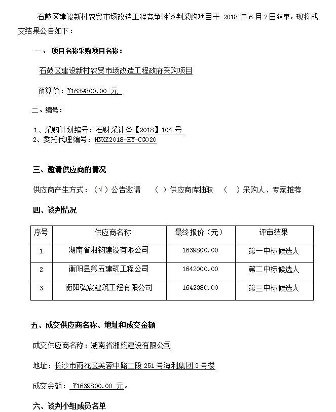 石鼓區(qū)建設(shè)新村農(nóng)貿(mào)市場改造工程政府采購項(xiàng)目 競爭性談判成交結(jié)果公告