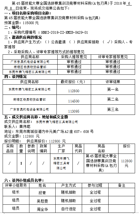 第45屆技能大賽全國選拔賽集訓(xùn)及競賽材料采購 (A包刃具) 競爭性談判成交公告