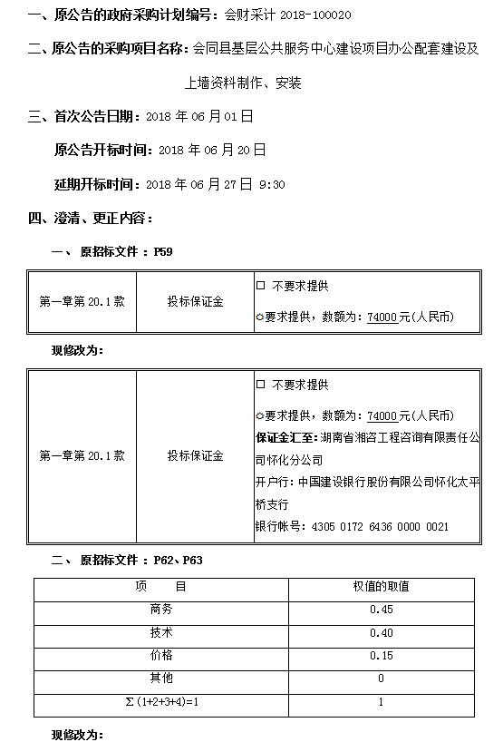 會(huì)同縣基層公共服務(wù)中心建設(shè)項(xiàng)目 辦公配套建設(shè)及上墻資料制作、安裝 澄清、更正公告