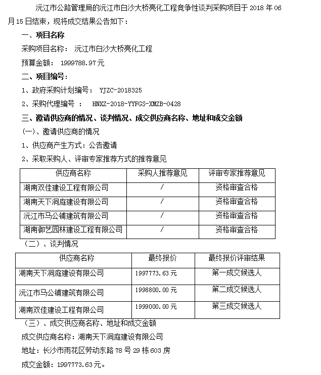 沅江市公路管理局的沅江市白沙大橋亮化工程競爭性談判成交結果公告