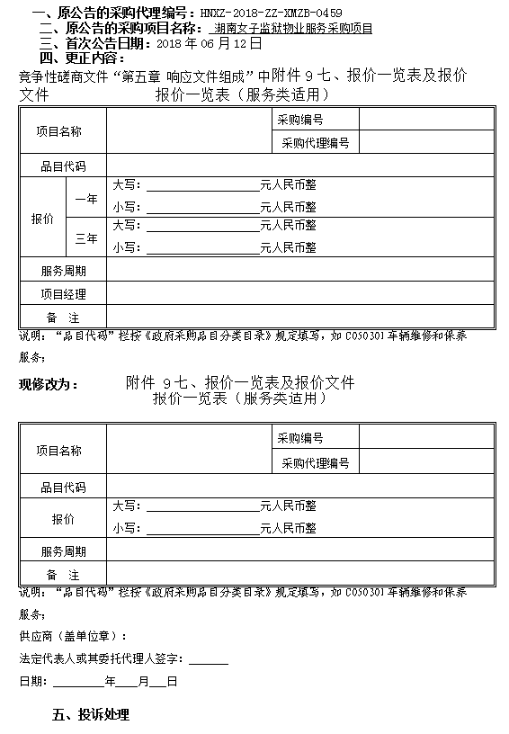 湖南女子監(jiān)獄物業(yè)服務(wù)采購(gòu)項(xiàng)目競(jìng)爭(zhēng)性磋商更正公告