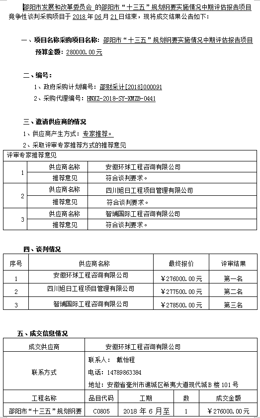 邵陽(yáng)市“十三五”規(guī)劃綱要實(shí)施情況中期評(píng)估報(bào)告項(xiàng)目談判成交公告