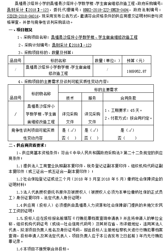 桑植縣沙塔坪小學(xué)教學(xué)樓、學(xué)生宿舍維修改造工程 談判公告