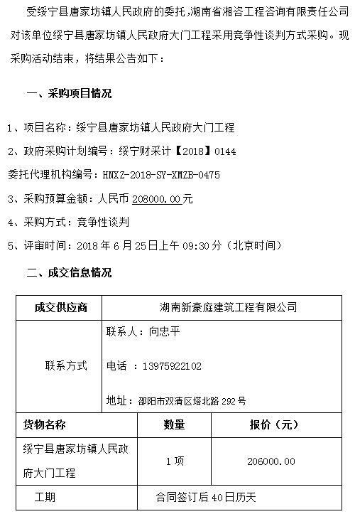 綏寧縣唐家坊鎮(zhèn)人民政府大門工程談判成交公告