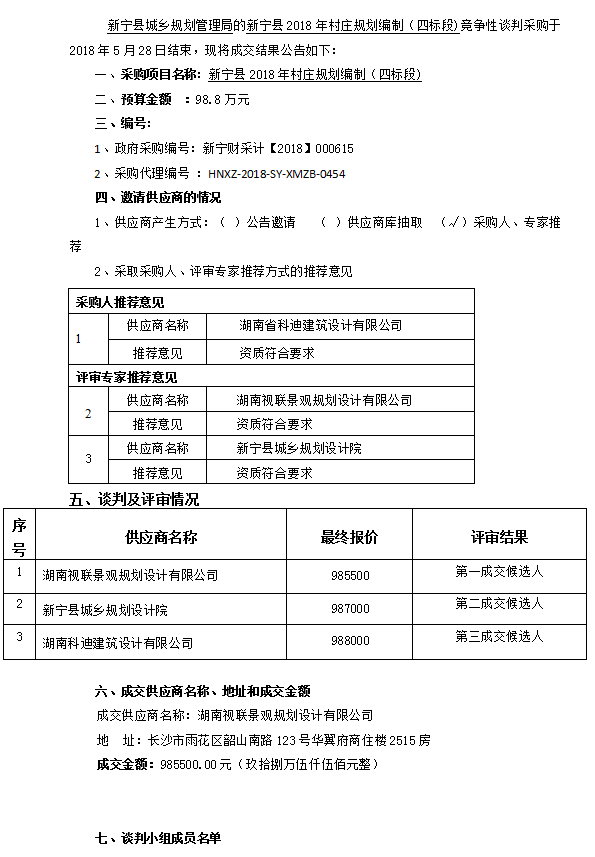 新寧縣2018年村莊規(guī)劃編制(四標(biāo)段) 競(jìng)爭(zhēng)性談判成交結(jié)果公告