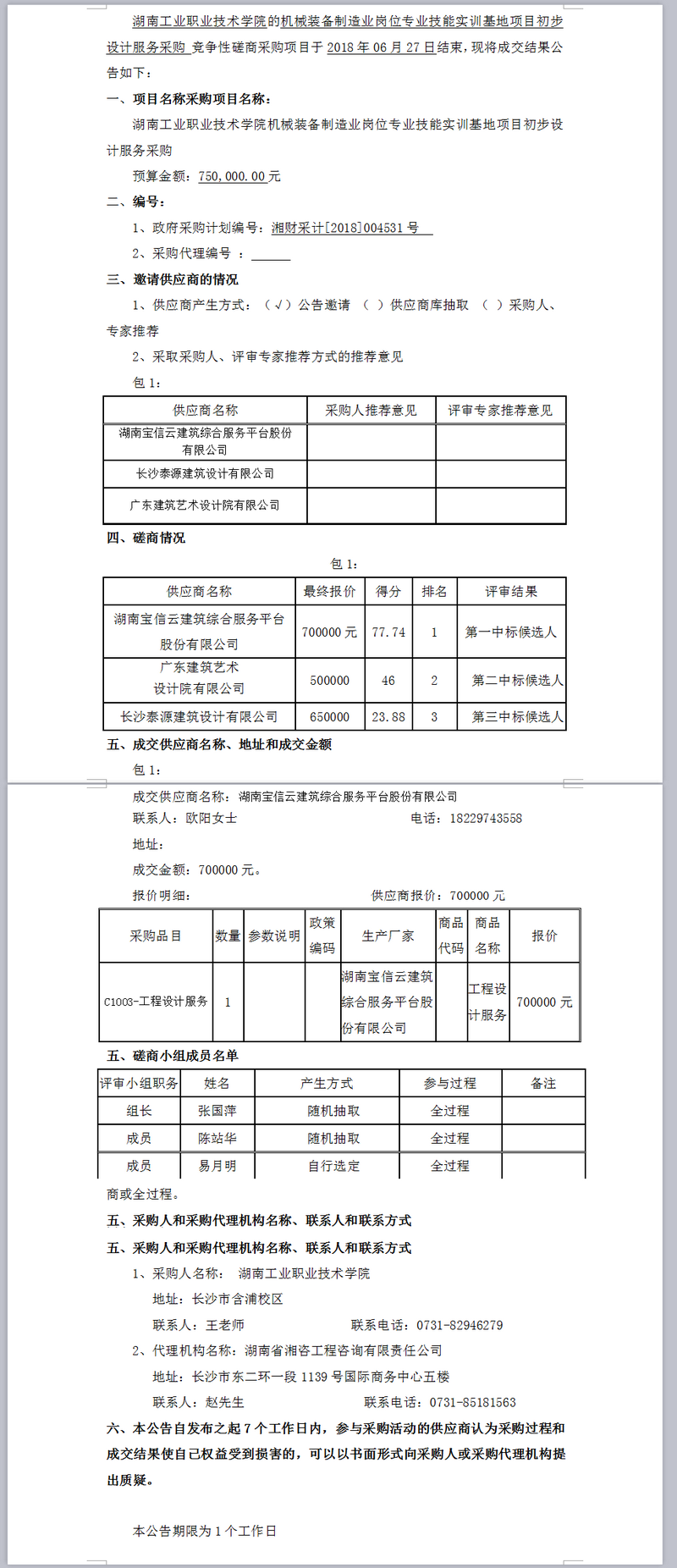 湖南工業(yè)職業(yè)技術(shù)學(xué)院機(jī)械裝備制造業(yè)崗位專業(yè)技能實(shí)訓(xùn)基地項(xiàng)目初步設(shè)計(jì)服務(wù)采購競爭性磋商成交公告