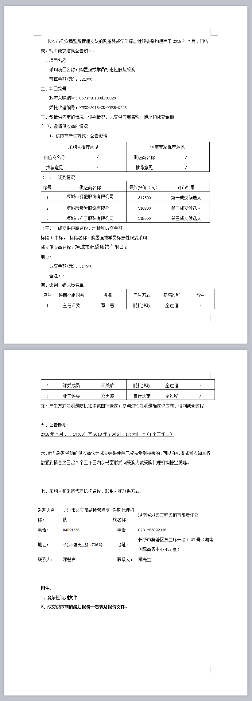 長(zhǎng)沙市公安局監(jiān)所管理支隊(duì)購(gòu)置強(qiáng)戒學(xué)員標(biāo)志性服裝采購(gòu)結(jié)果公告