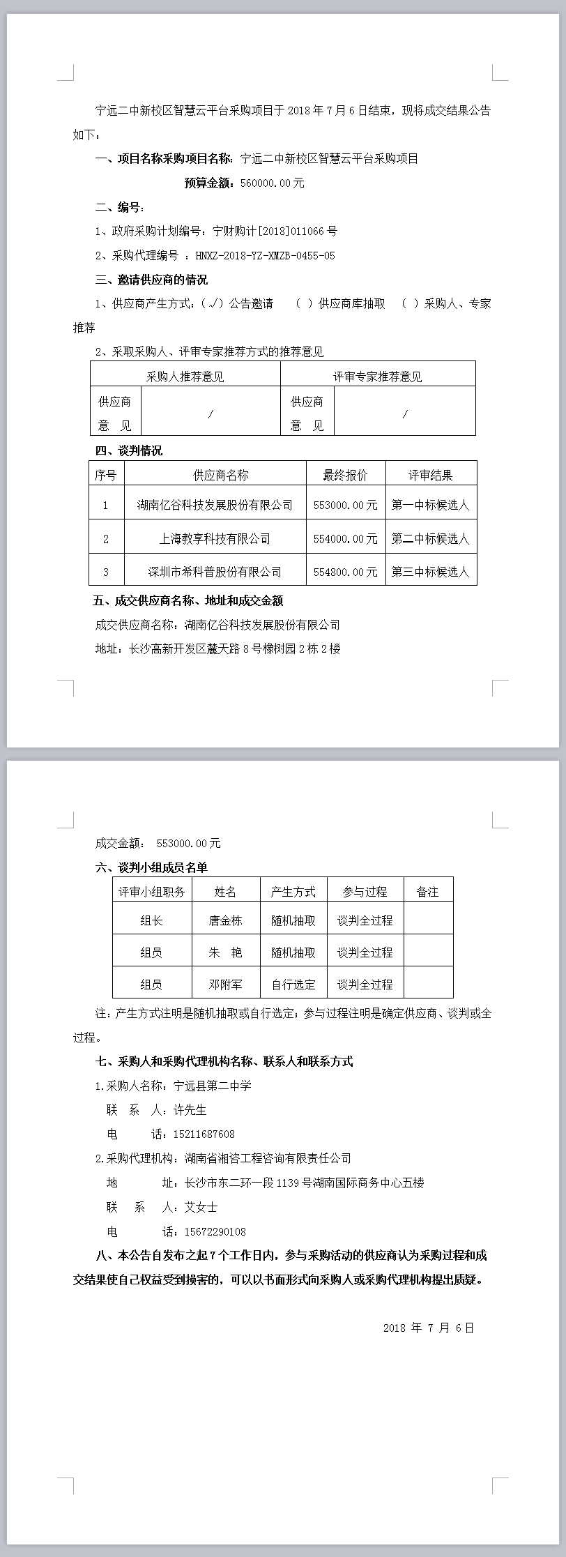 寧遠二中新校區(qū)智慧云平臺采購項目競爭性談判成交結(jié)果公告