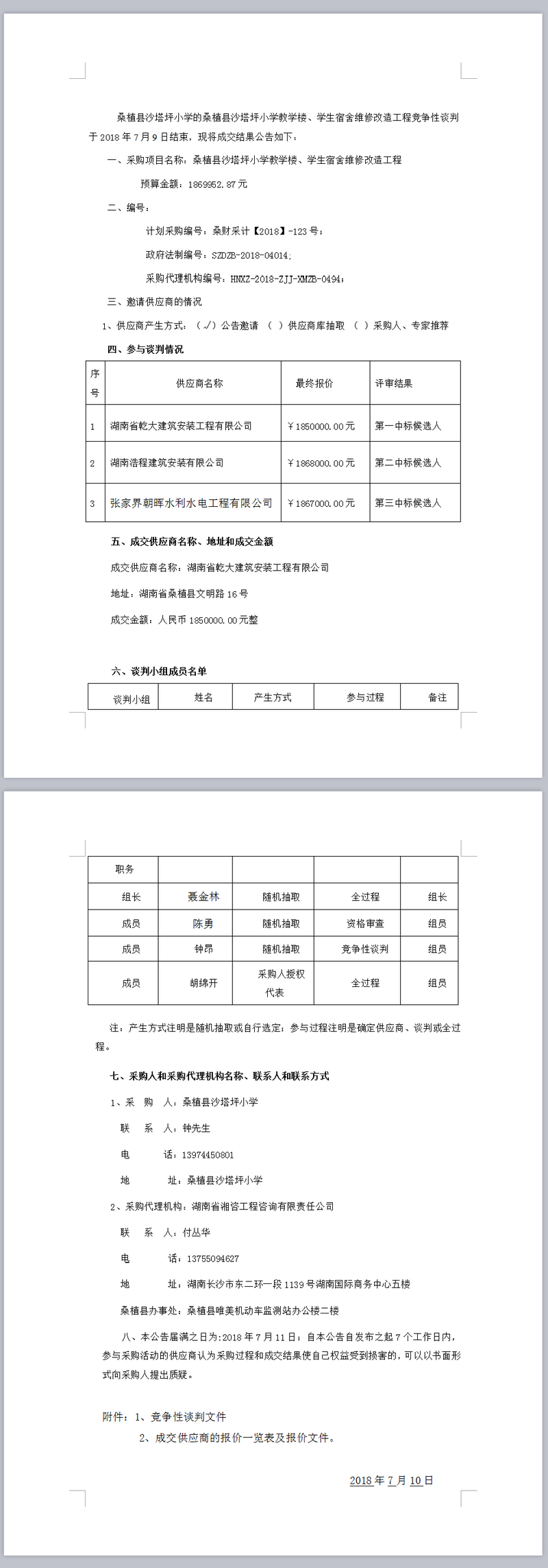 桑植縣沙塔坪小學(xué)教學(xué)樓、學(xué)生宿舍維修改造工程談判成交公告