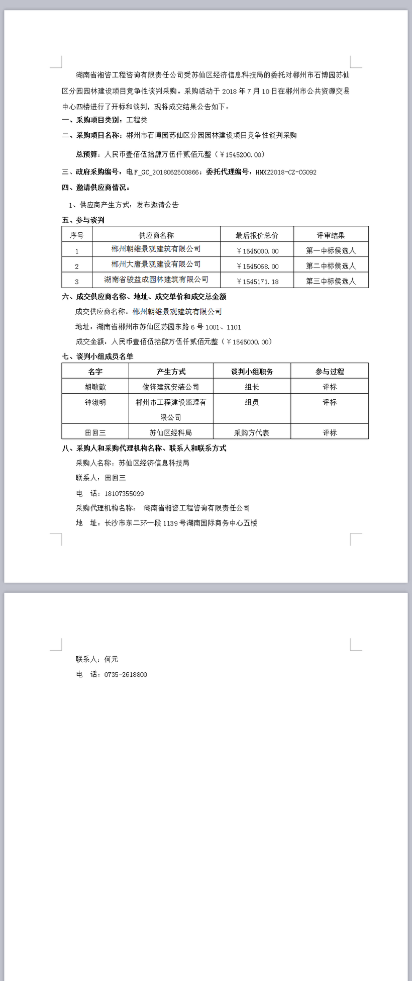 郴州市石博園蘇仙區(qū)分園園林建設(shè)項目競爭性談判采購成交公告