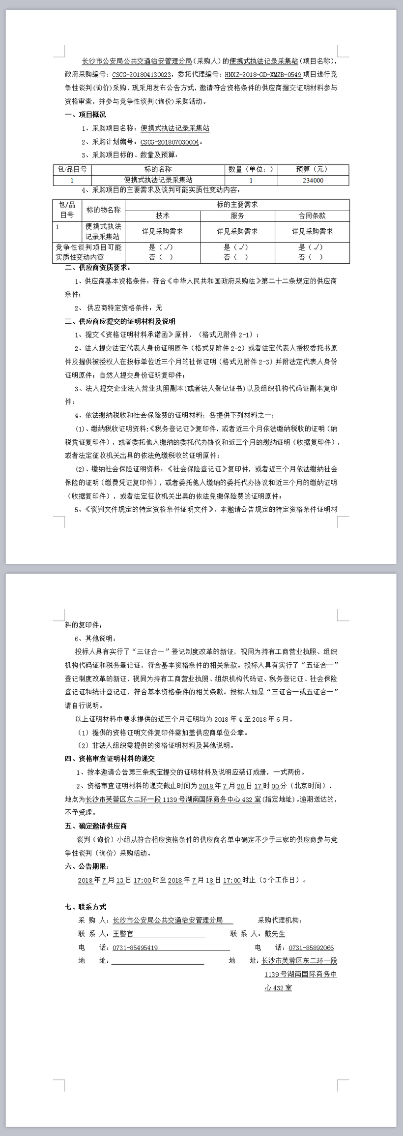 長沙市公安局公共交通治安管理分局便攜式執(zhí)法記錄采集站競爭性談判邀請公告