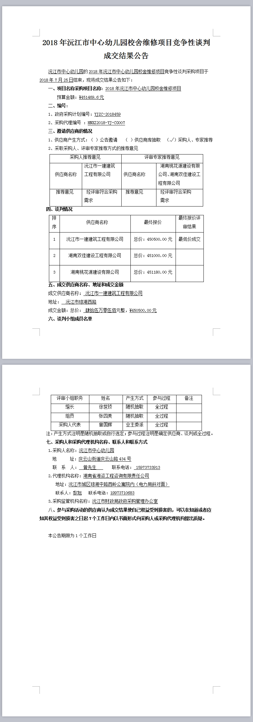 2018年沅江市中心幼兒園校舍維修項目競爭性談判成交結(jié)果公告