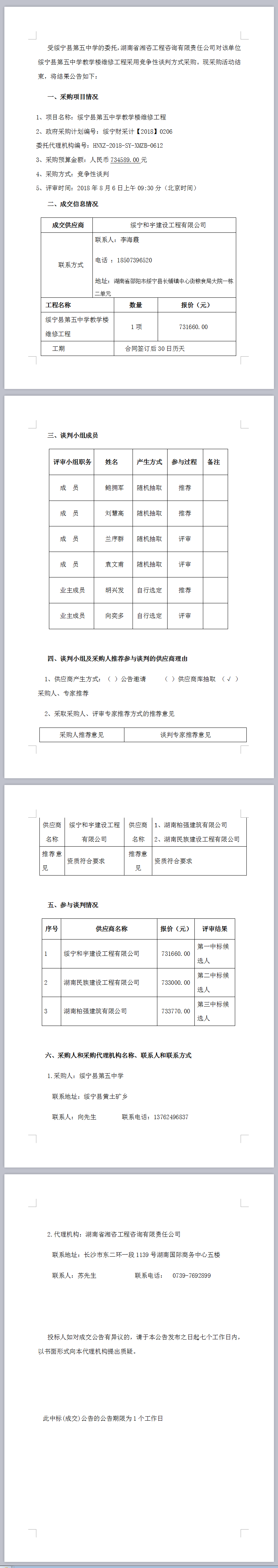綏寧縣第五中學(xué)教學(xué)樓維修工程談判成交公告
