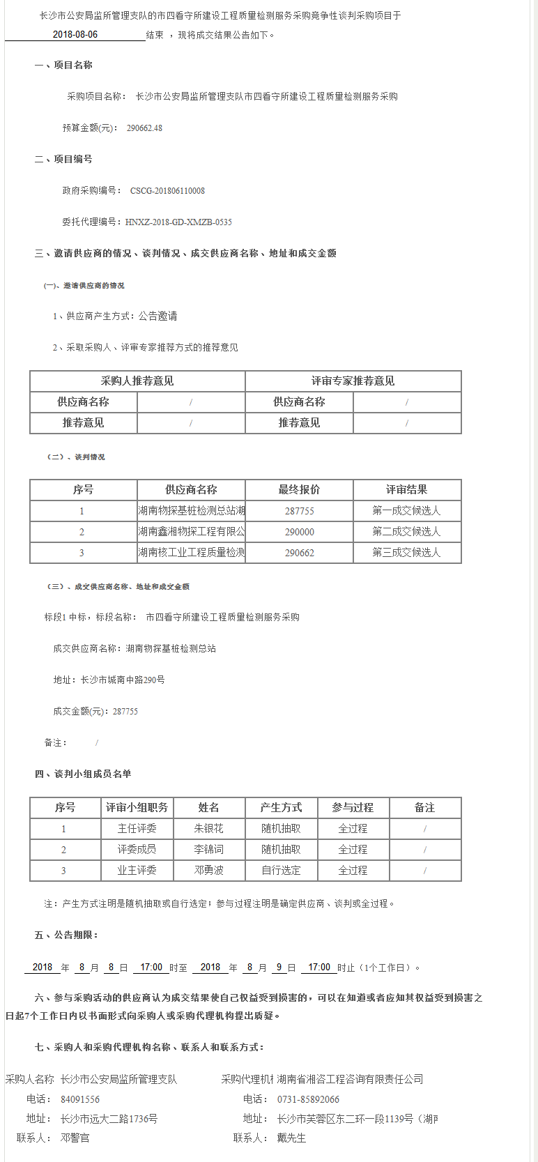 長沙市公安局監(jiān)所管理支隊市四看守所建設(shè)工程質(zhì)量檢測服務(wù)采購結(jié)果公告