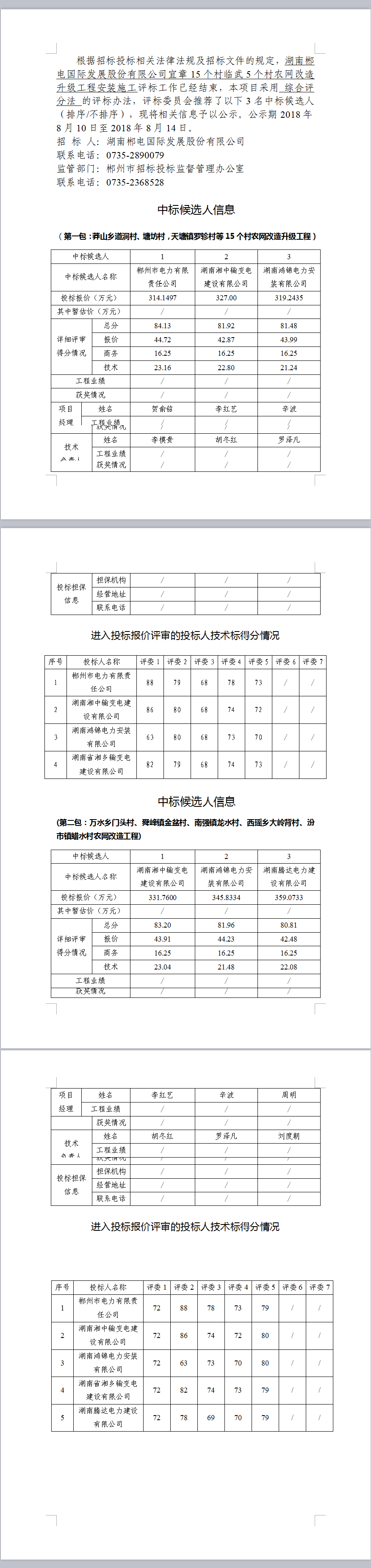湖南郴電國(guó)際發(fā)展股份有限公司宜章15個(gè)村臨武5個(gè)村農(nóng)網(wǎng)改造升級(jí)工程安裝施工中標(biāo)候選人公示