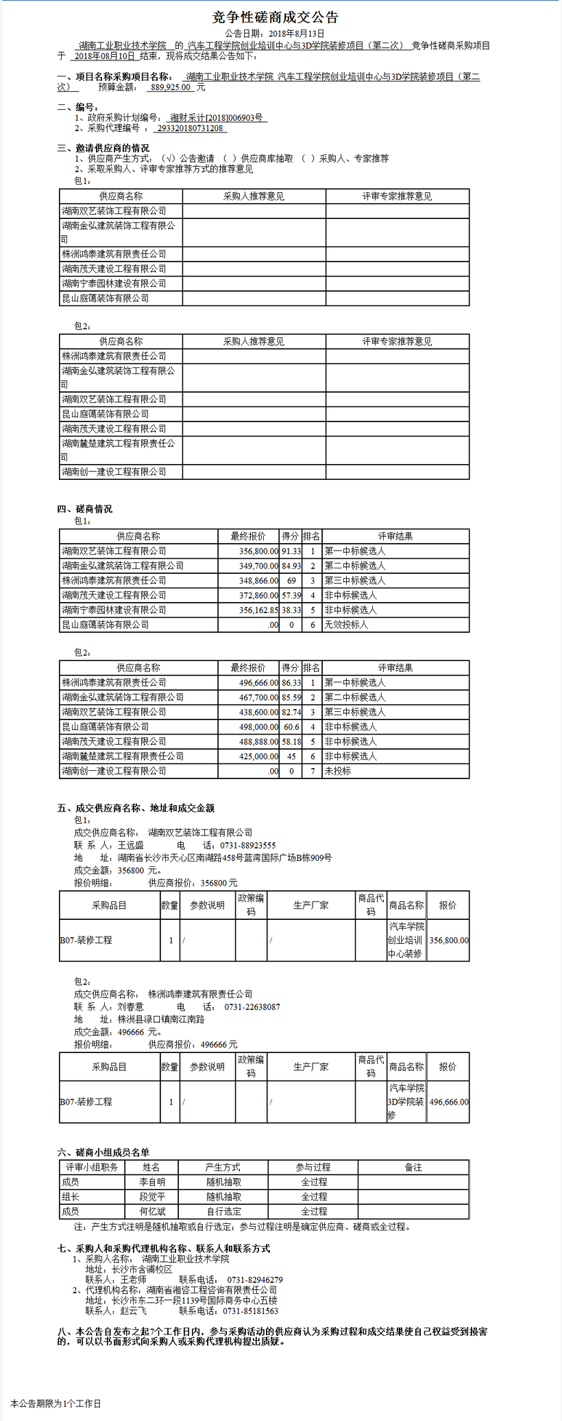 湖南工業(yè)職業(yè)技術(shù)學院汽車工程學院的創(chuàng)業(yè)培訓中心和3D學院裝修工程項目(第二次)競爭性磋商成交公告