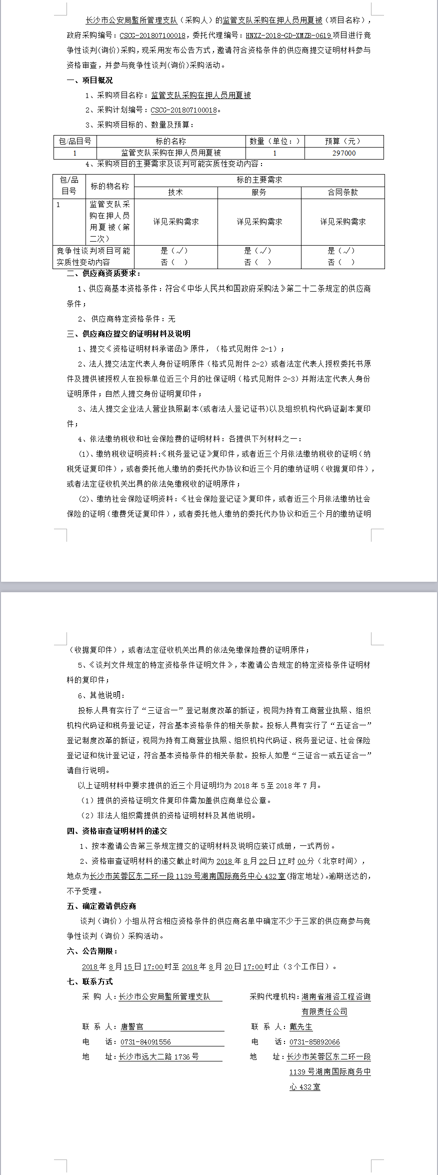 長(zhǎng)沙市公安局監(jiān)所管理支隊(duì)監(jiān)管支隊(duì)采購(gòu)在押人員用夏被(第二次)競(jìng)爭(zhēng)性談判邀請(qǐng)公告