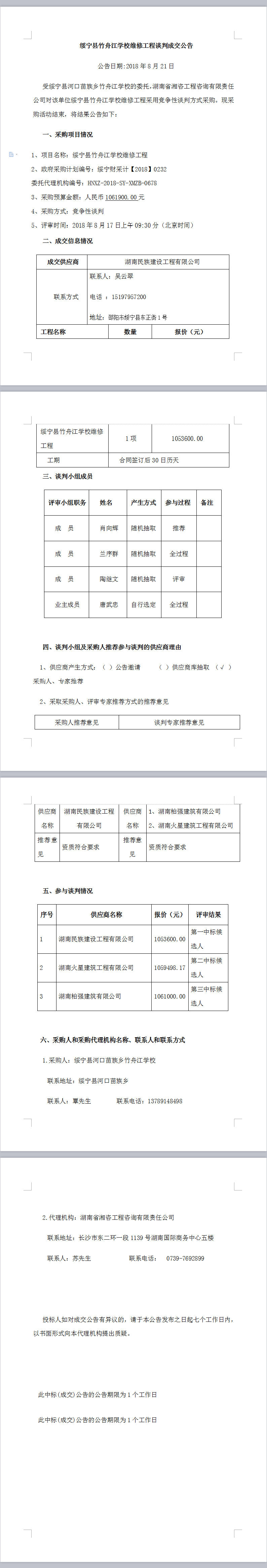 綏寧縣竹舟江學(xué)校維修工程談判成交公告