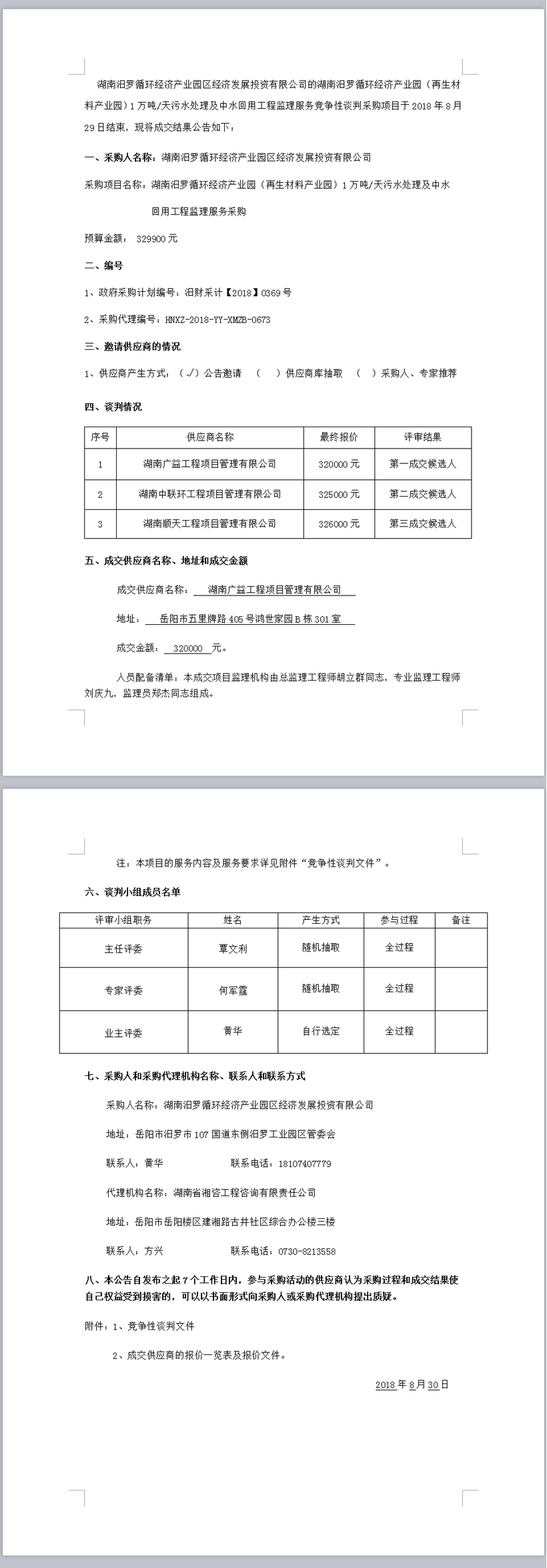 湖南汨羅循環(huán)經(jīng)濟(jì)產(chǎn)業(yè)園(再生材料產(chǎn)業(yè)園)1萬(wàn)噸/天污水處理及中水回用工程監(jiān)理服務(wù)政府采購(gòu)項(xiàng)目競(jìng)爭(zhēng)性談判成交結(jié)果公告