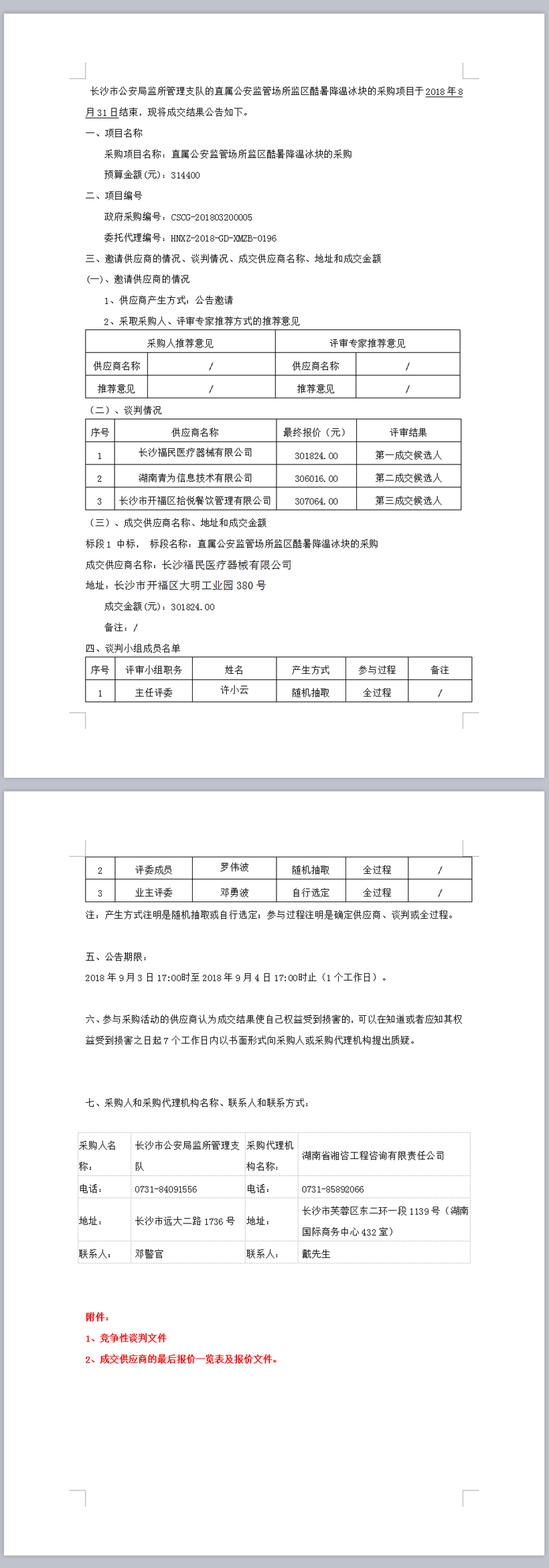 長沙市公安局監(jiān)所管理支隊直屬公安監(jiān)管場所監(jiān)區(qū)酷暑降溫冰塊的采購結果公告