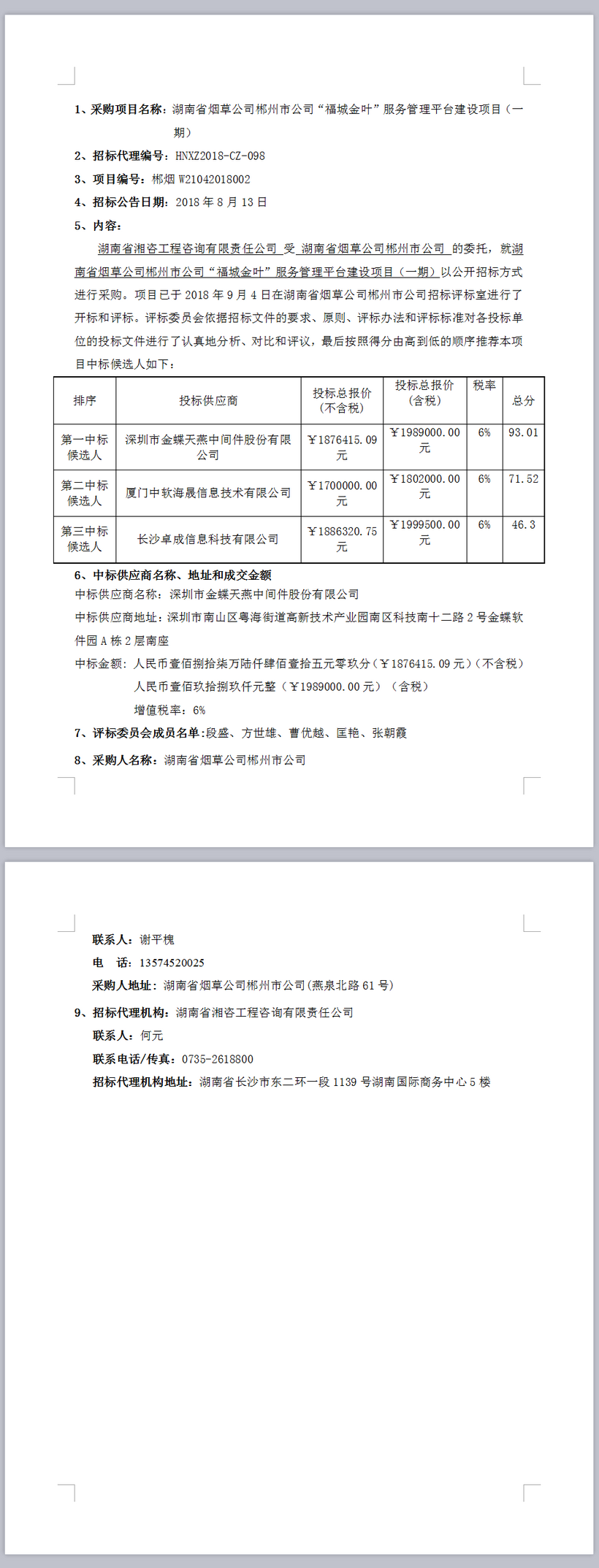 湖南省煙草公司郴州市公司“福城金葉”服務(wù)管理平臺(tái) 建設(shè)項(xiàng)目(一期)中標(biāo)結(jié)果公示