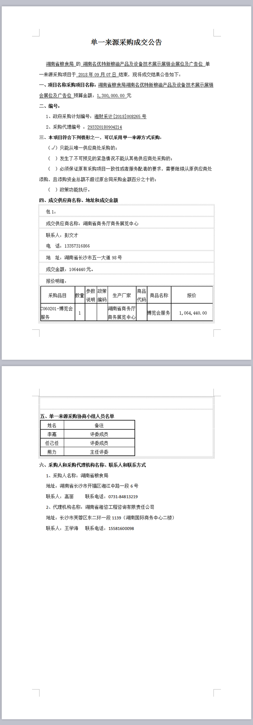 湖南省糧食局湖南名優(yōu)特新糧油產(chǎn)品及設備技術展示展銷會展位及廣告位單一來源采購成交公告