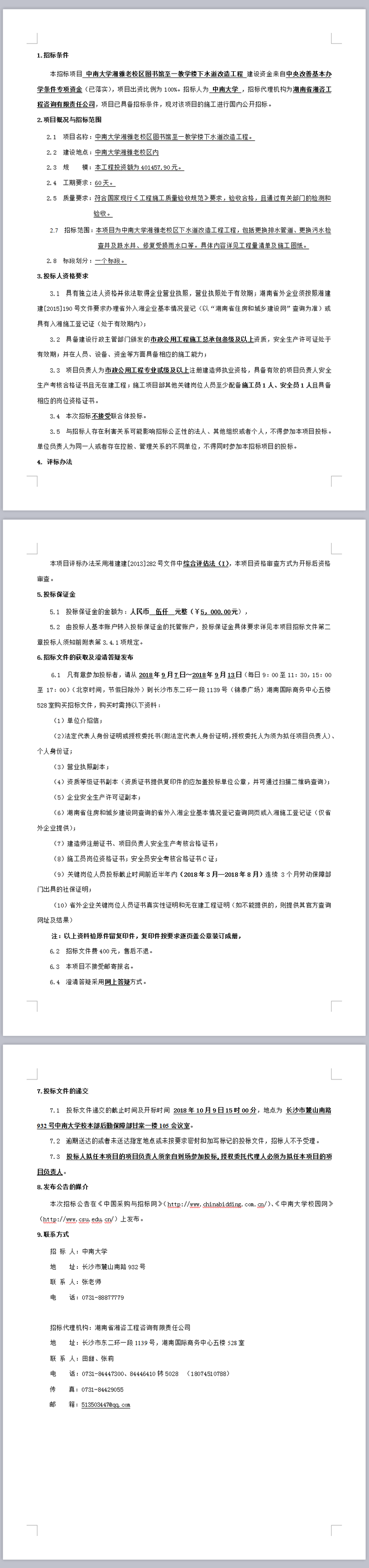 中南大學湘雅老校區(qū)圖書館至一教學樓下水道改造工程 招標公告