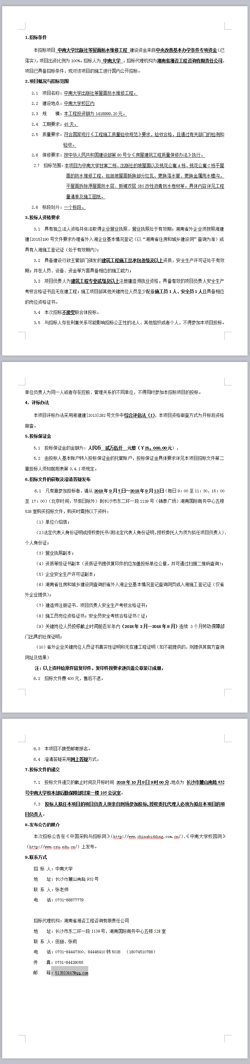中南大學(xué)出版社等屋面防水維修工程招標(biāo)公告