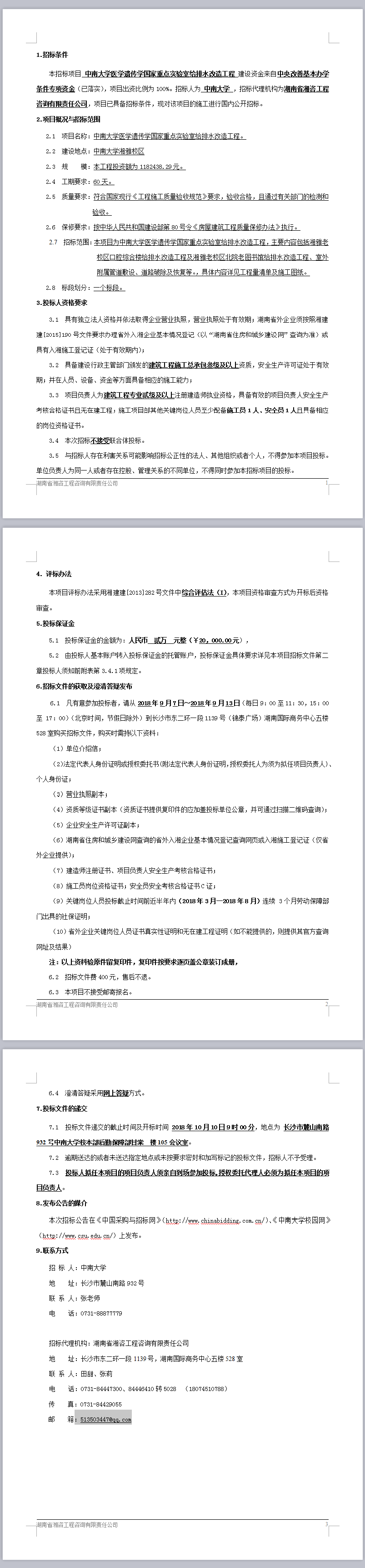 中南大學醫(yī)學遺傳學國家重點實驗室給排水改造工程招標公告