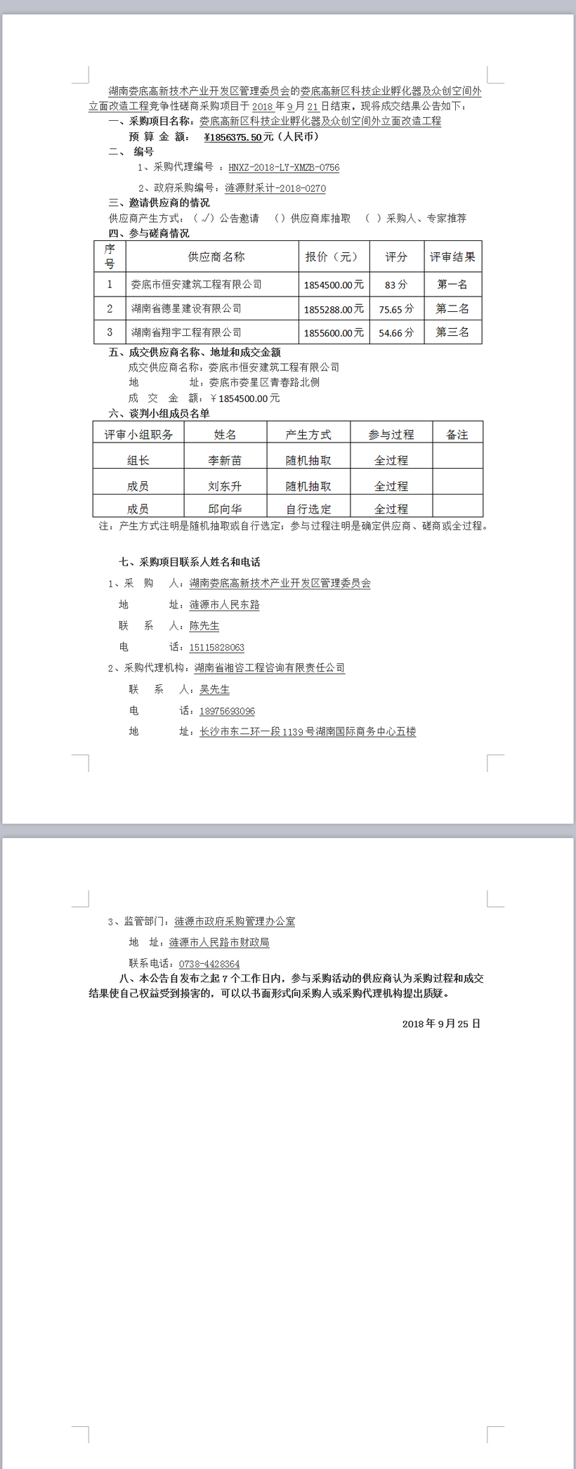 婁底高新區(qū)科技企業(yè)孵化器及眾創(chuàng)空間外立面改造工程競爭性磋商成交公告
