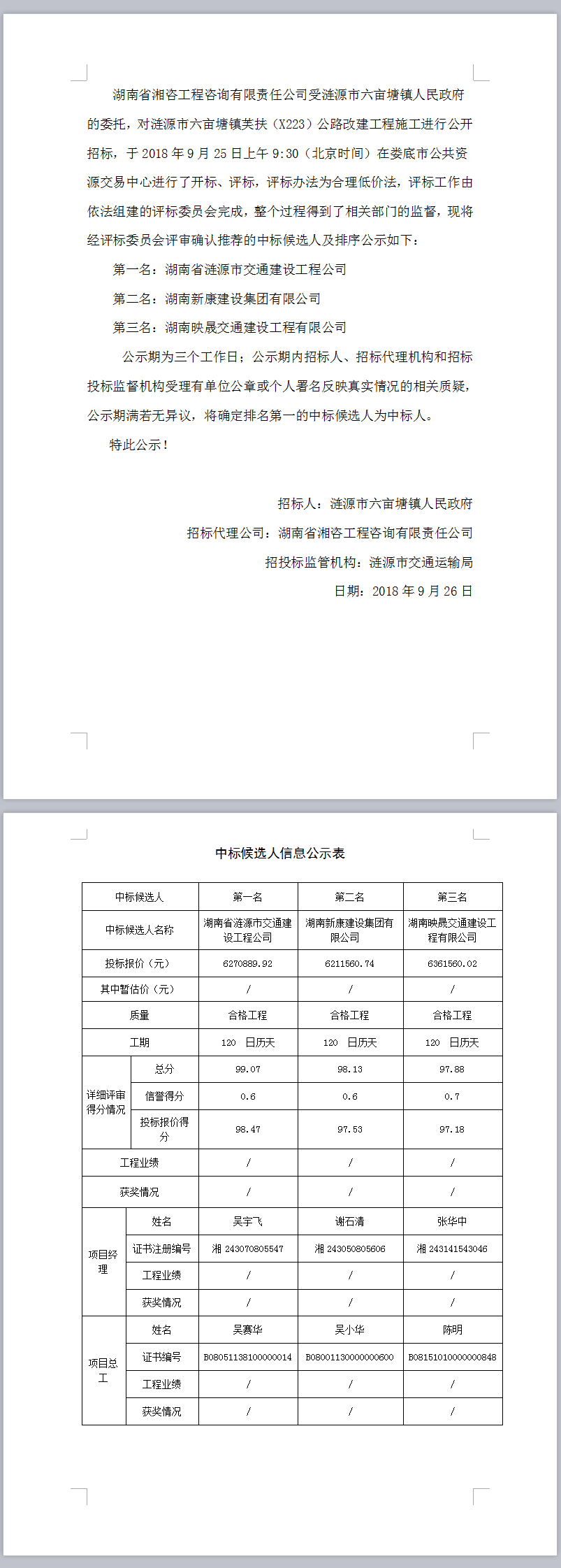 漣源市六畝塘鎮(zhèn)芙扶(X223)公路改建工程施工中標(biāo)候選人公示