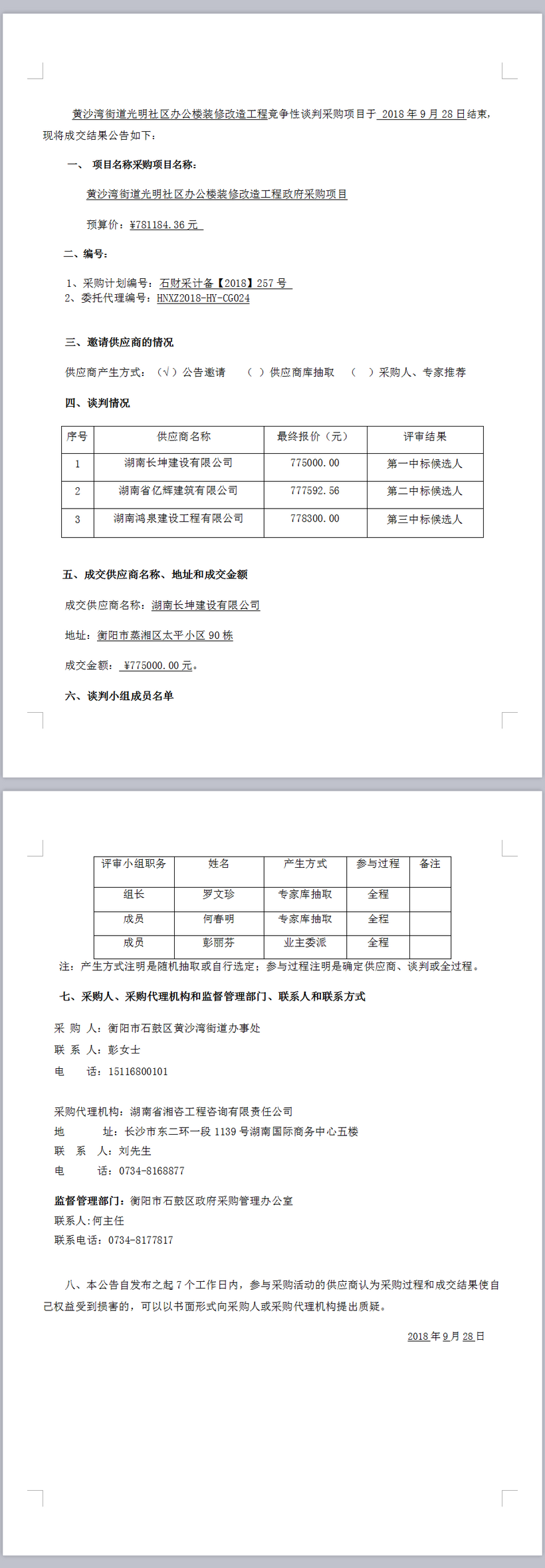 黃沙灣街道光明社區(qū)辦公樓裝修改造工程政府采購項(xiàng)目競爭性談判成交結(jié)果公告