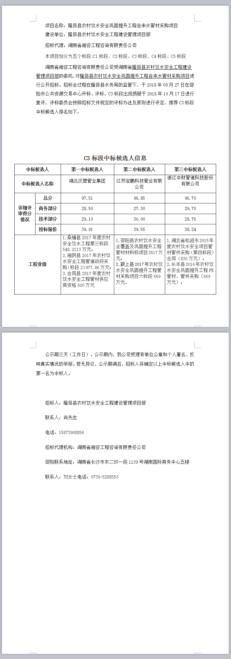 隆回縣農(nóng)村飲水安全鞏固提升工程自來(lái)水管材采購(gòu)項(xiàng)目招標(biāo)投標(biāo)信息公示表(C3標(biāo)段復(fù)評(píng))