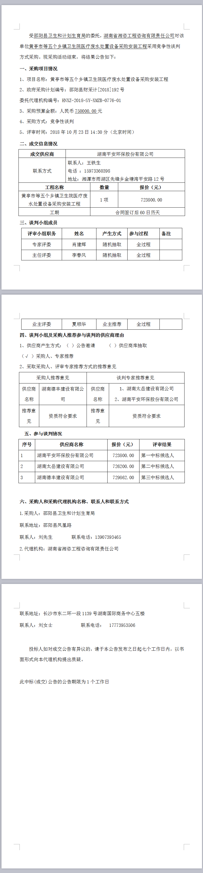 黃亭市等五個(gè)鄉(xiāng)鎮(zhèn)衛(wèi)生院醫(yī)療廢水處置設(shè)備采購(gòu)安裝工程談判成交公告
