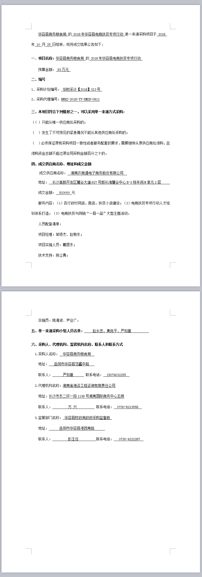 2018年華容縣電商扶貧專項(xiàng)行動(dòng) 單一來源采購成交結(jié)果公告