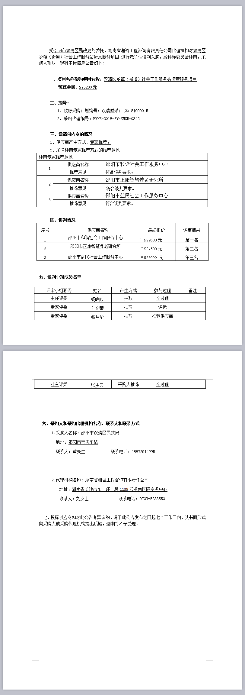 湖南省雙清區(qū)鄉(xiāng)鎮(zhèn)(街道)社會(huì)工作服務(wù)站運(yùn)營服務(wù)項(xiàng)目競爭性談判成交公告