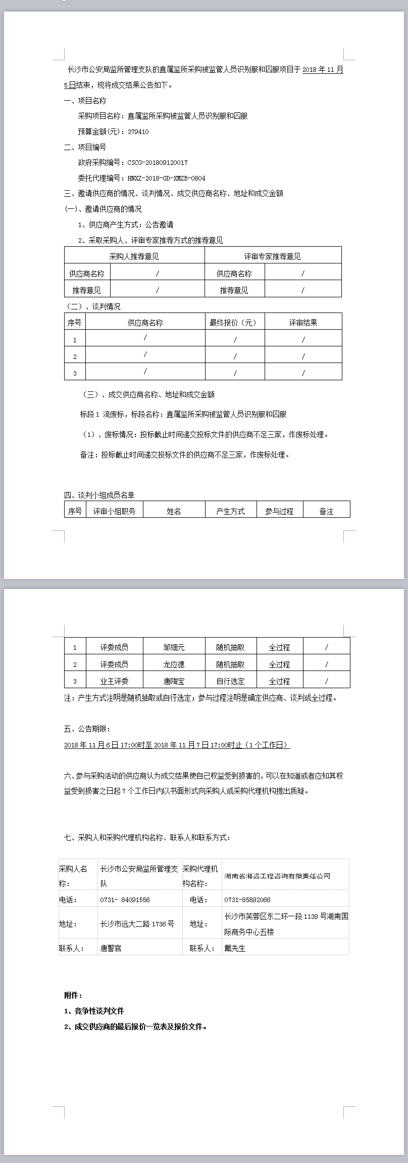 長沙市公安局監(jiān)所管理支隊直屬監(jiān)所采購被監(jiān)管人員識別服和囚服結果公告