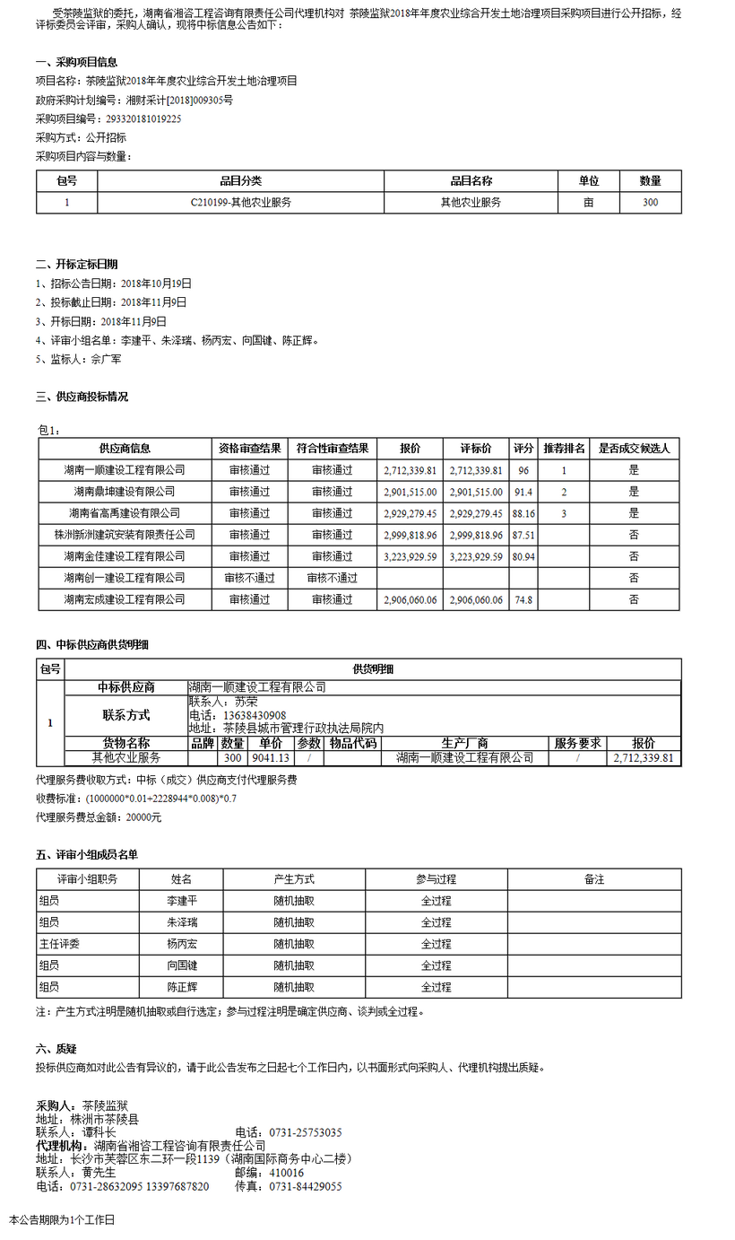 茶陵監(jiān)獄2018年年度農(nóng)業(yè)綜合開發(fā)土地治理公開招標(biāo)中標(biāo)公告