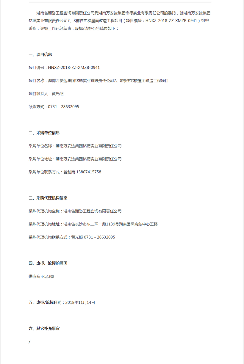 湖南萬安達集團銘德實業(yè)有限責任公司7、8棟住宅樓屋面改造工程項目廢標公告/流標公告