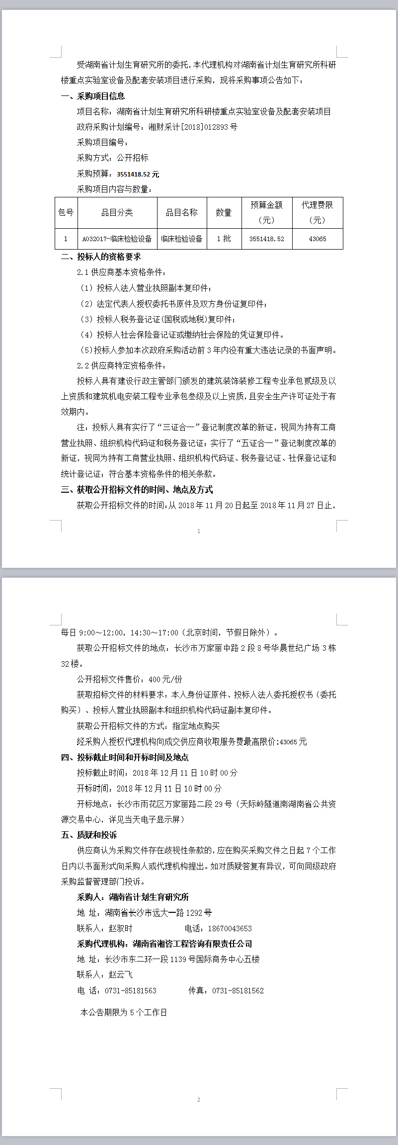 湖南省計劃生育研究所科研樓重點實驗室 設備及配套安裝項目公開招標公告