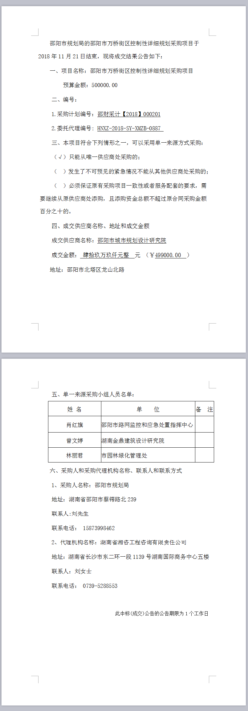 邵陽市萬橋街區(qū)控制性詳細(xì)規(guī)劃采購項目 單一來源成交公告