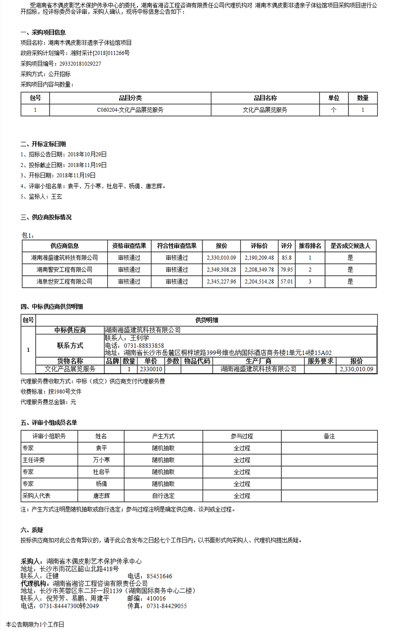 湖南省木偶皮影藝術(shù)保護(hù)傳承中心湖南木偶皮影非遺親子體驗館公開招標(biāo)中標(biāo)公告