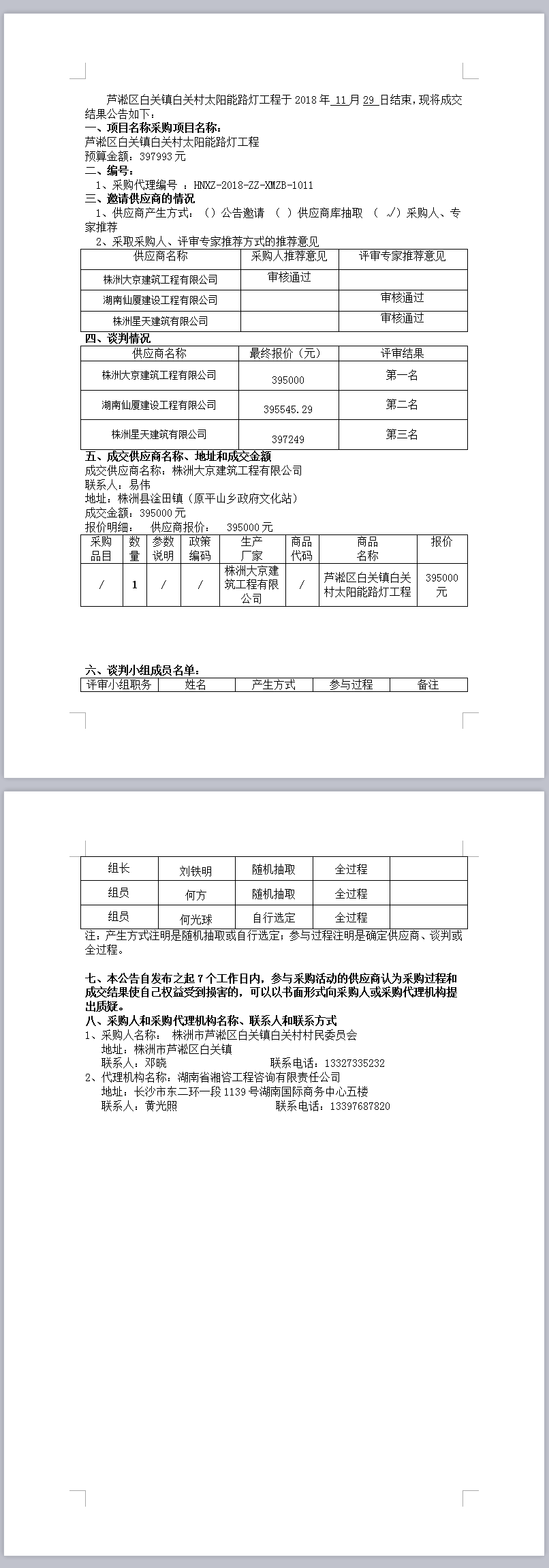 蘆淞區(qū)白關鎮(zhèn)白關村太陽能路燈工程 競爭性談判成交公告