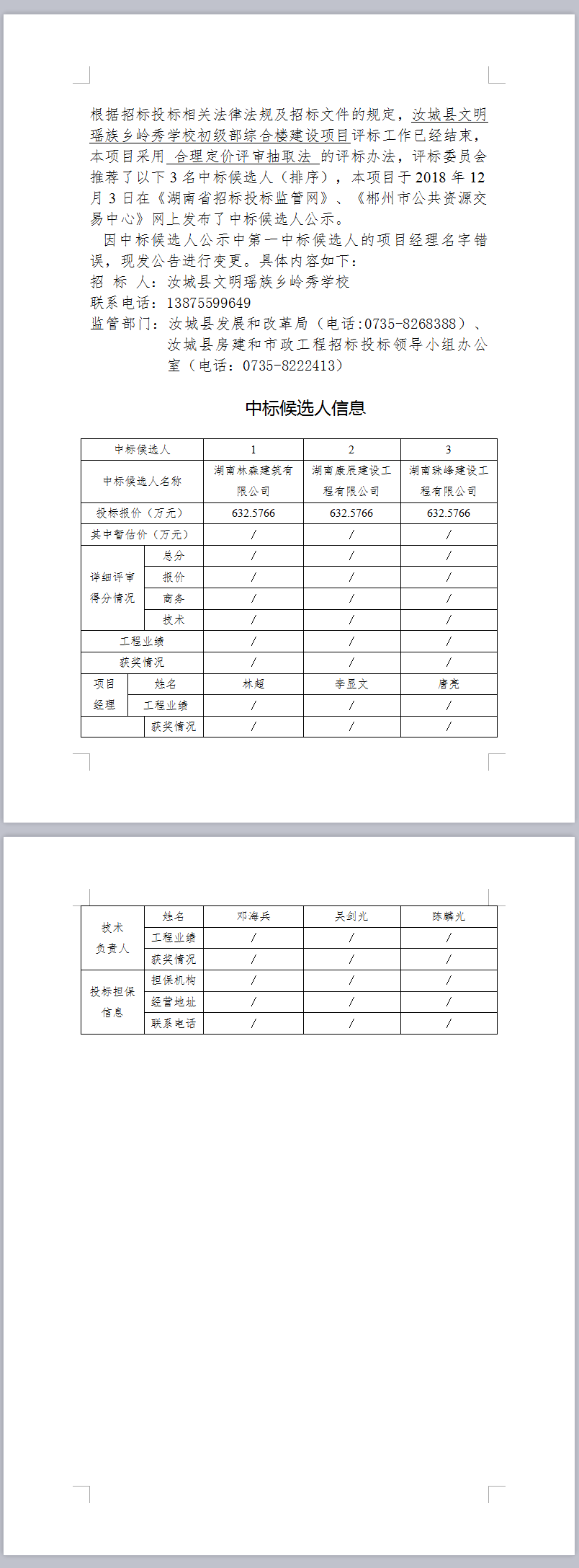汝城縣文明瑤族鄉(xiāng)嶺秀學校初級部綜合樓建設(shè)項目中標候選人公示(變更)