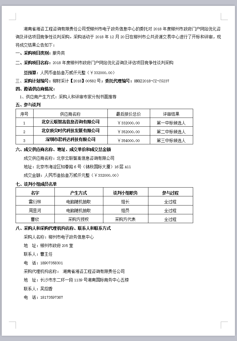 2018年度郴州市政府門戶網(wǎng)站優(yōu)化咨詢及評(píng)估項(xiàng)目競(jìng)爭(zhēng)性談判采購(第二次)成交公告