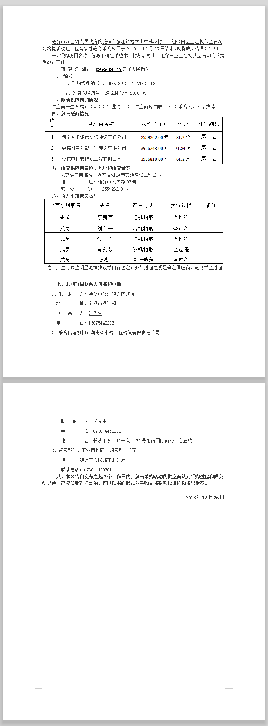 漣源市湄江鎮(zhèn)檀木山村蘇家村山下組蒎田至王江枧頭至石陶公路提質(zhì)改造工程競(jìng)爭(zhēng)性磋商成交結(jié)果公告