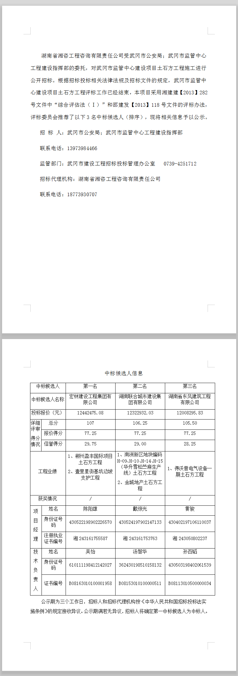 武岡市監(jiān)管中心建設(shè)項目土石方工程施工中標候選人公示