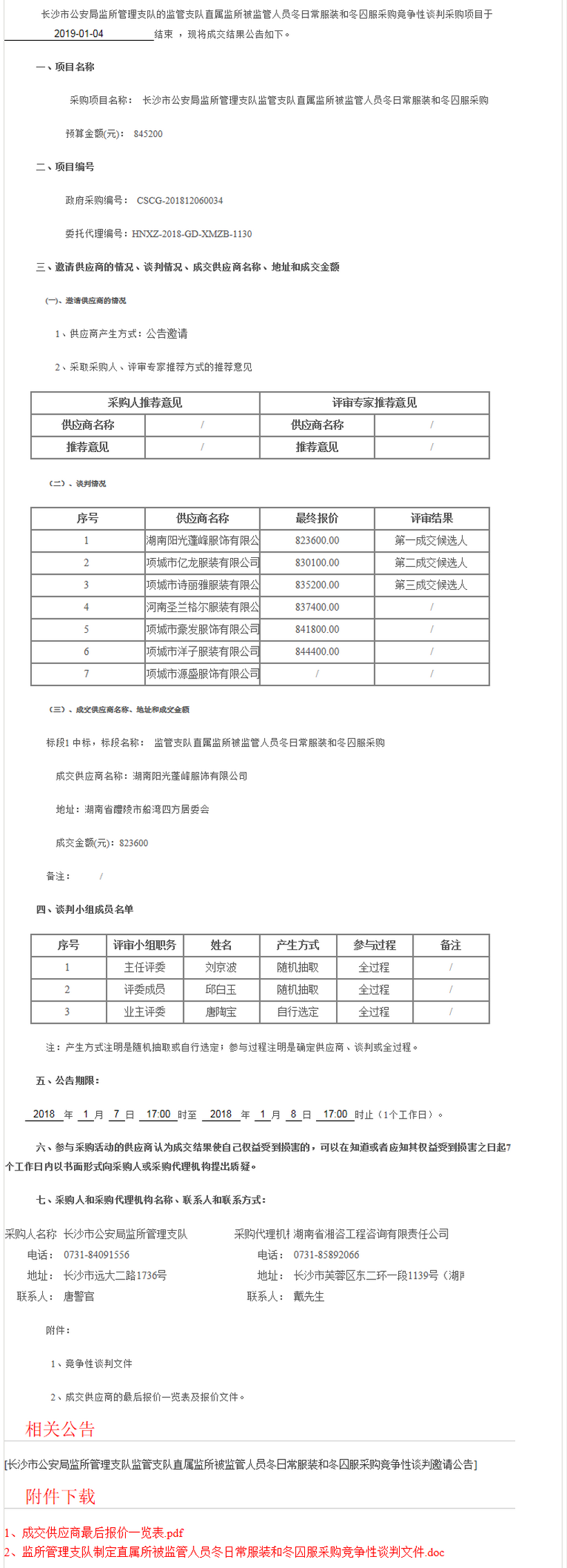 長沙市公安局監(jiān)所管理支隊監(jiān)所管理支隊制定直屬所被監(jiān)管人員冬日常服裝和冬囚服采購結(jié)果公告